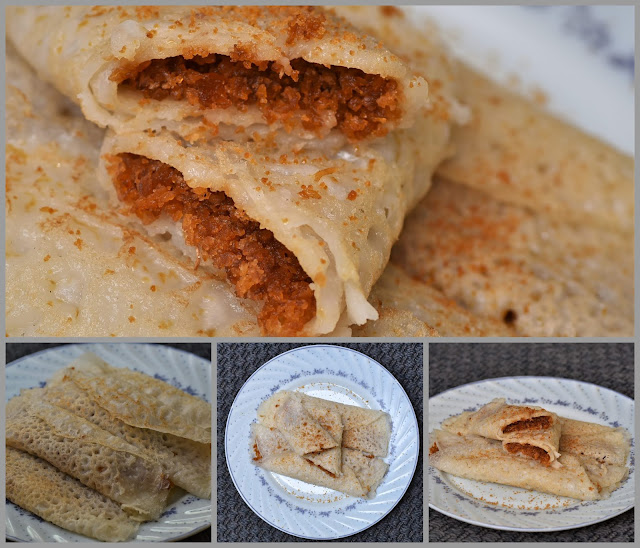 Step 2: Heat a Tawa or pan and brush it with a few drops of oil. Lower the flame. Pour the batter into it with a deep ladle and spread it immediately to make a round thin layer. Cover it for a minute to cook. Add the coconut and jaggery mix as filling and fold it as shown in the picture below. Press it gently and take it out in a plate. Make the remaining pithas following the same steps.