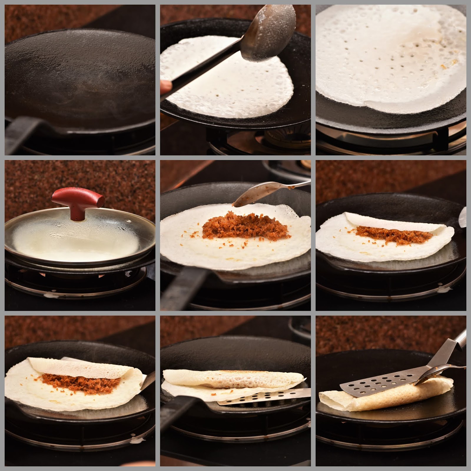 Step 2: Heat a Tawa or pan and brush it with a few drops of oil. Lower the flame. Pour the batter into it with a deep ladle and spread it immediately to make a round thin layer. Cover it for a minute to cook. Add the coconut and jaggery mix as filling and fold it as shown in the picture below. Press it gently and take it out in a plate. Make the remaining pithas following the same steps.