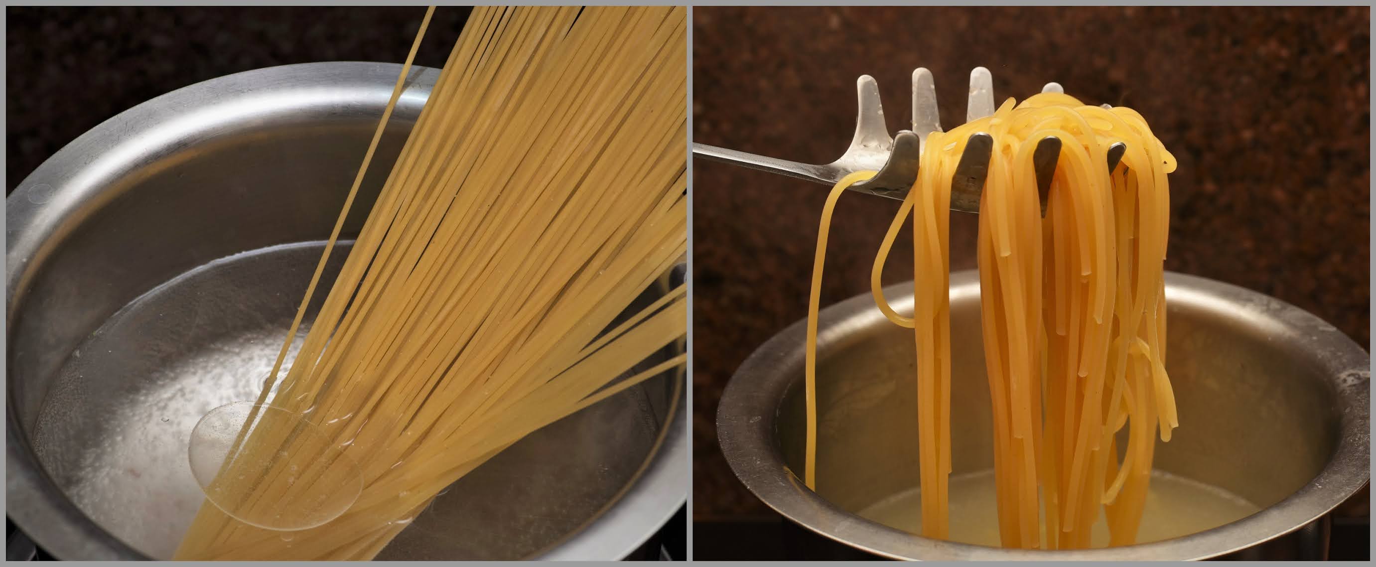 Step 2: Boil the spaghetti pasta as per the instructions provided on the packet. It will take around 8-10 minutes. Once boiled wash it in running water, strain the water, and keep it aside. Drizzle a few drops of oil over it to avoid sticking.