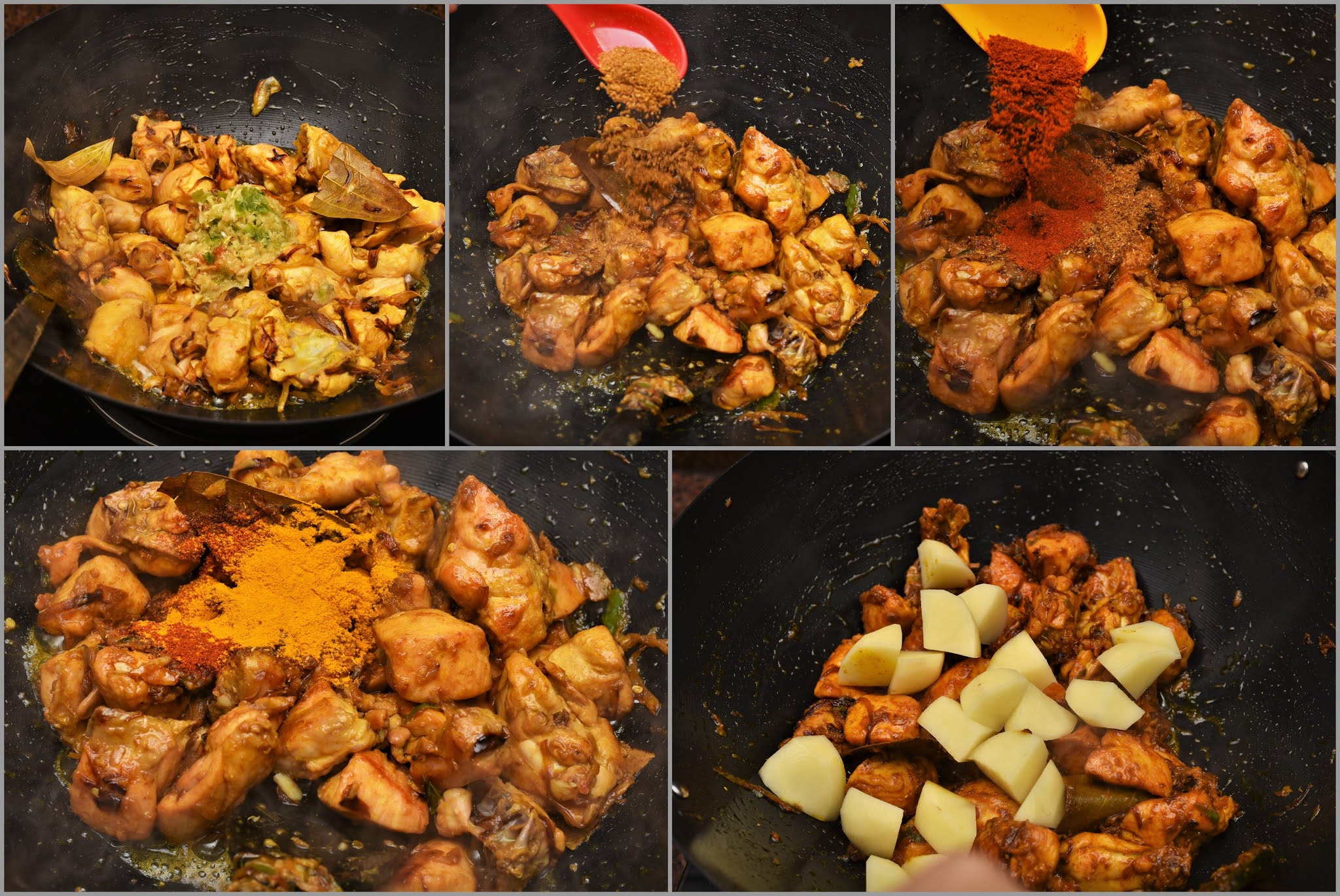 Step 3: In a mortar, grind ginger, garlic, and green chillies together to make a paste. Now add this paste into the chicken and saute for 5 minutes in medium heat. Add the dry spices (turmeric powder, curry masala, red chilli powder), potatoes, and salt as per taste. I have used a homemade curry masala (a mixture of cumin, coriander and fennel seeds). Saute it for 3-5 minutes, add a little water if needed to avoid burning.