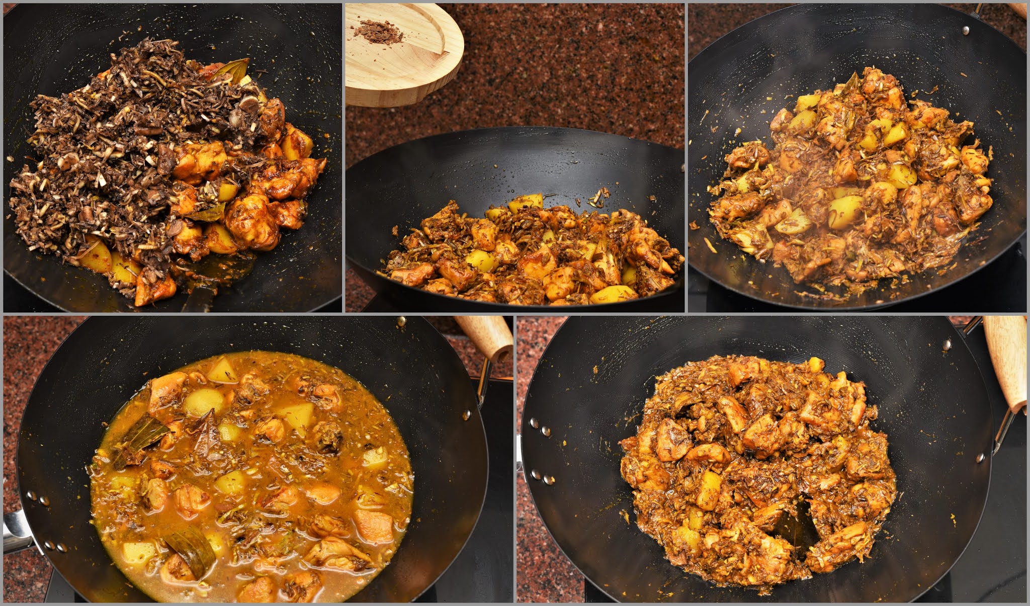 Step 4: Once the spices are mixed with the chicken and potatoes add the chopped banana flowers into it. Don’t forget to strain the water and squeeze out excess water properly before adding it to the cooking. Roughly grind the cinnamon stick and add it into the wok. Stir it for another 5-8 minutes and add about 350-400 ml water for cooking. Cover it and let it simmer in low flame for the next 30-45 minutes. Once the water is dried, saute it for 2-3 minutes in medium flame and turn the gas off.