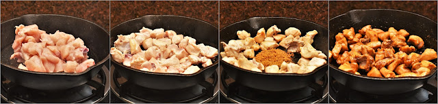 Step 1: Heat a pan and add 2-3 tablespoons of cooking oil. Once the oil is hot enough add the chicken, sprinkle a pinch of salt and saute it in high flame. The chicken will release water after some time, let the water evaporate completely and stir fry the chicken until it turns light brown. Push the chicken at the sides and make space in the middle of the pan. Add jaggery in the middle of the pan and let it melt. Now mix it with the chicken and saute it until the chicken is coated with jaggery and turns golden brown colour.