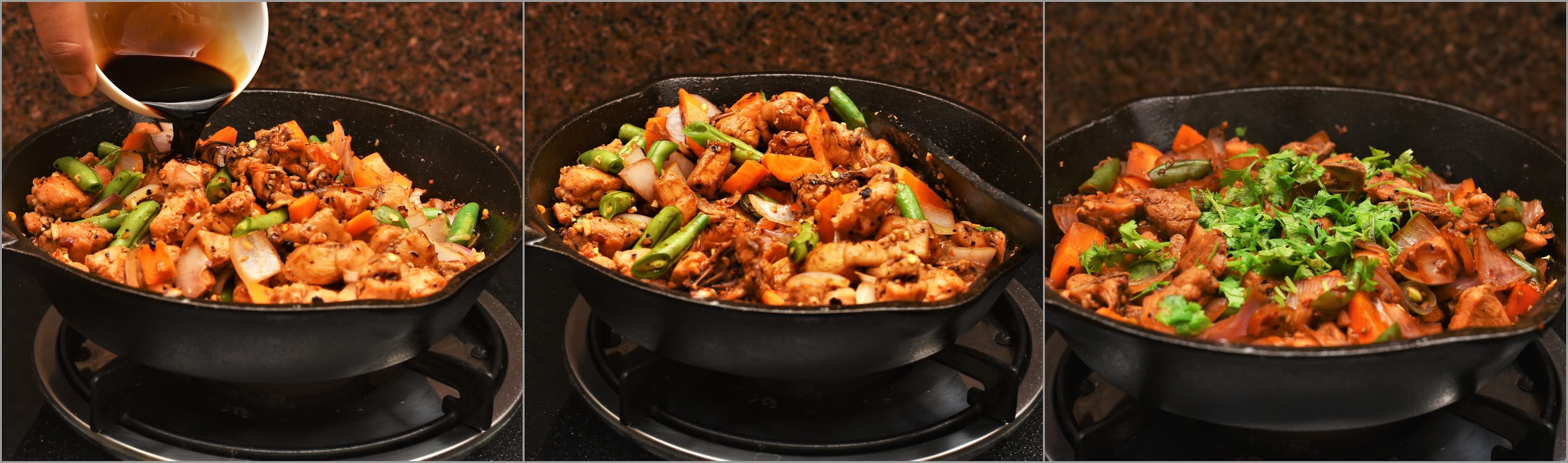 Step 3: Mix light and dark soy sauce with vinegar as per the above-mentioned proportion and add it into the pan. Mix it well with the chicken and vegetables. Add half a cup of water and cover the lid. Let it cook for 5 minutes in medium flame until the water is evaporated. If required sprinkle a pinch of salt, but be careful with the salt as soy sauce contains a good amount of salt in it. After 5 minutes remove the lid, add chopped coriander and saute it for another 2-3 minutes in medium to high flame until it is dry.
