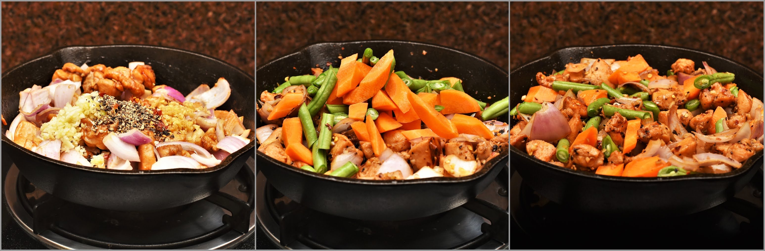 Try this hot and sweet chicken fry recipe when you crave for something spicy next time. Especially on a cold rainy day! In this preparation, I used some vegetables along with the chicken. You can skip the vegetable part or consider it optional as per personal preferences. The heat of the chilli pepper is perfectly balanced by the jaggery, a tangy sauce and sesame seeds that will provide you forkful of mixed juicy flavour accented by a nutty note. The same recipe can be prepared with any other meat such as mutton, beef or pork as well, according to personal choices. Have a look!
