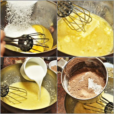 Step 1: Break the eggs in a mixing bowl, add sugar, butter and whisk it for two minutes. Add the milk and whisk it again. Mix flour, chocolate powder, baking powder in a separate bowl or a sieve, add a pinch of salt in it and add it into the mixing bowl for the batter. Whisk it well until it becomes smooth.