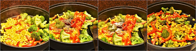 Step 3: Vegetable stir fry- Heat a pan and add one tablespoon of oil. Once hot, add the vegetables, a pinch of salt, crush some black pepper over it, add the dried parsley and oregano and sauté it for 2-3 minutes in medium flame. Do not overcook the vegetables. Let it be crunchy and juicy.