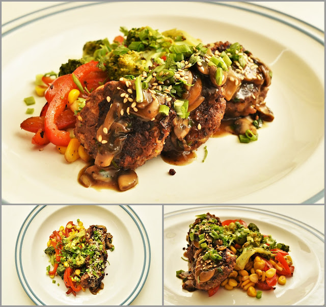 A well-balanced diet what we all need that includes all required nutrition in a single platter. Most of our regular calories come from grains, proteins, fruits or vegetables, nuts and fats. So, here is a simple recipe of a meal platter with minced meatball patty, sautéed vegetables covered in a sweet and tangy mushroom sauce enlivened by the taste of Balsamic vinegar. This savoury selection laced with the meatiness, juicy sweet corns and crunchy vegetables will give you a bursting of flavours in each forkful bite. The vegetarian may replace the meat with other alternatives such as beans, tofu, cottage cheese (paneer) or minced soy chunks and enjoy this lovely platter. Here you go!