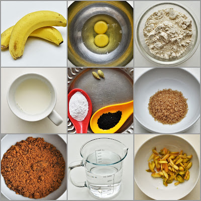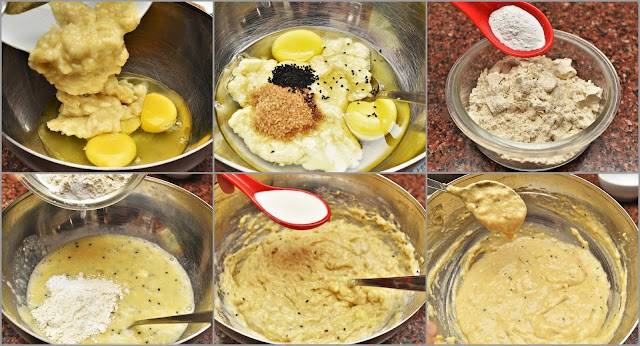 Step 2: For the batter, first mash the bananas with the help of a fork. Now add mashed bananas, eggs, one tablespoon sugar, nigella seeds into a bowl and whisk it. In a separate bowl mix flour and baking powder and add it into the batter mix. If the batter is too thick, add 2 to 3 tablespoons (or as required) of milk. Mix the batter well to make it smooth.