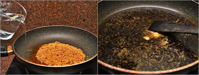 Step 1: First, prepare the jaggery syrup. Add jaggery and water in a pan and bring it to boil. Add two pods of cardamom and simmer it in medium flame for 15 to 20 minutes or until the syrup is ready. Keep stirring the syrup occasionally throughout the process. To check, touch it with your fingertips, slightly sticky means it is done. Turn the gas off and keep it aside.