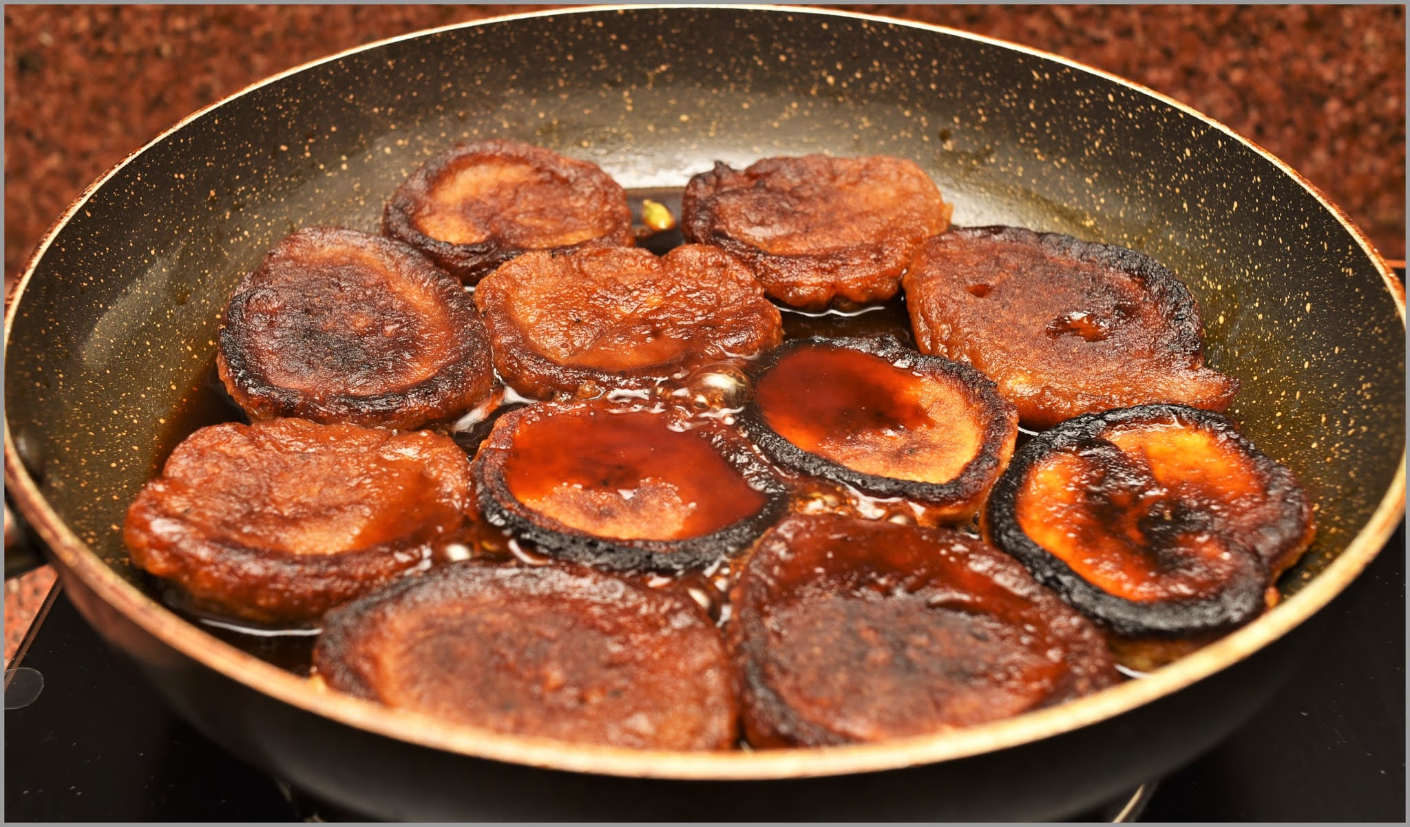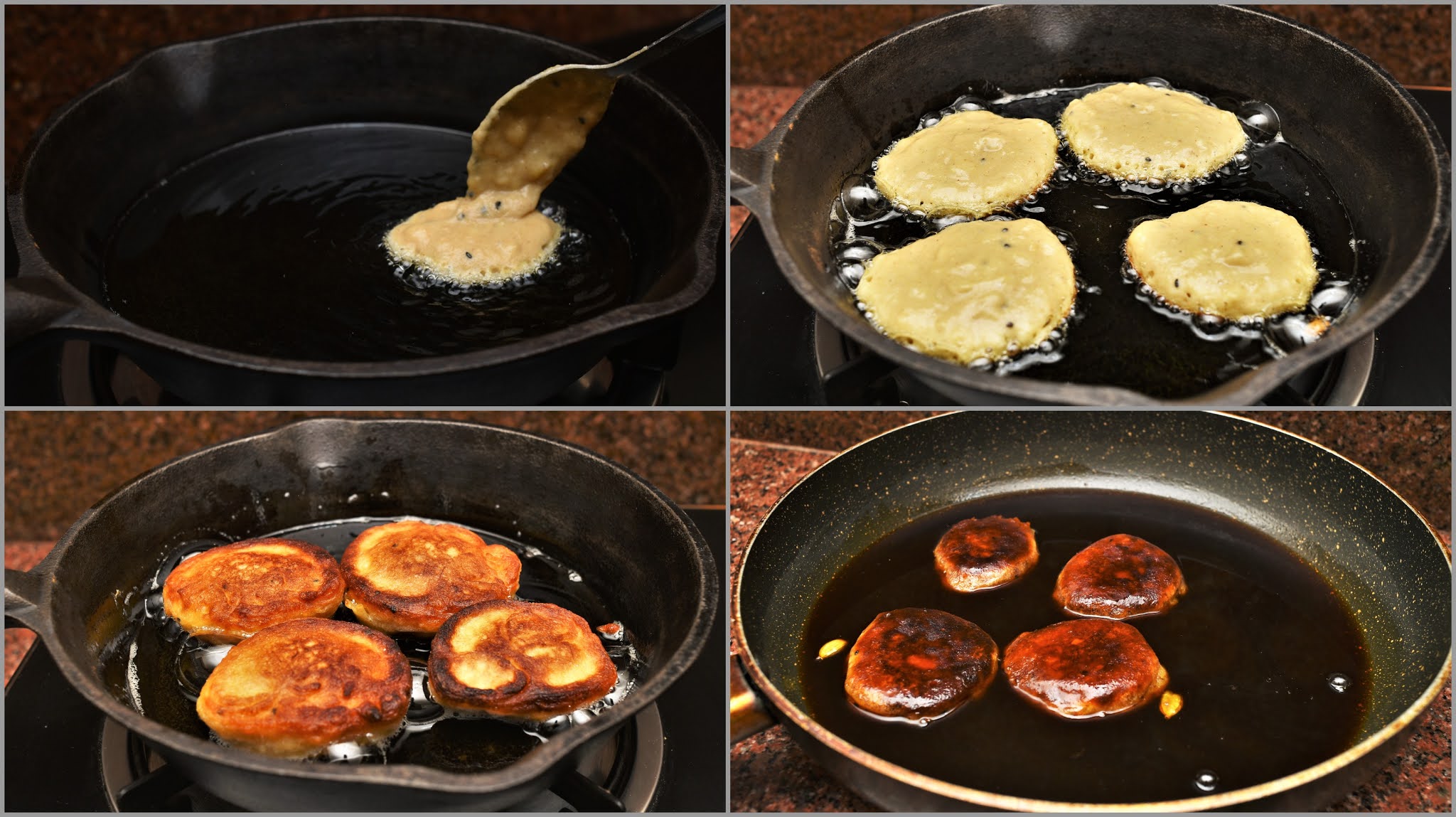 Step 3: Heat a pan and add cooking oil for frying. Once the oil is hot enough lower the flame as much as you can. Take one tablespoon of the mixture and drop it into the pan for frying. According to the size of the pan keep adding the portions. Fry both sides of the cakes until it turns dark brown and cooked from inside, which might take around 5-7 minutes. Keep turning the pieces frequently to avoid burning. Once done strain the oil and immediately dip the cakes into the jaggery syrup and cover it. Follow the same process to make the remaining cakes.