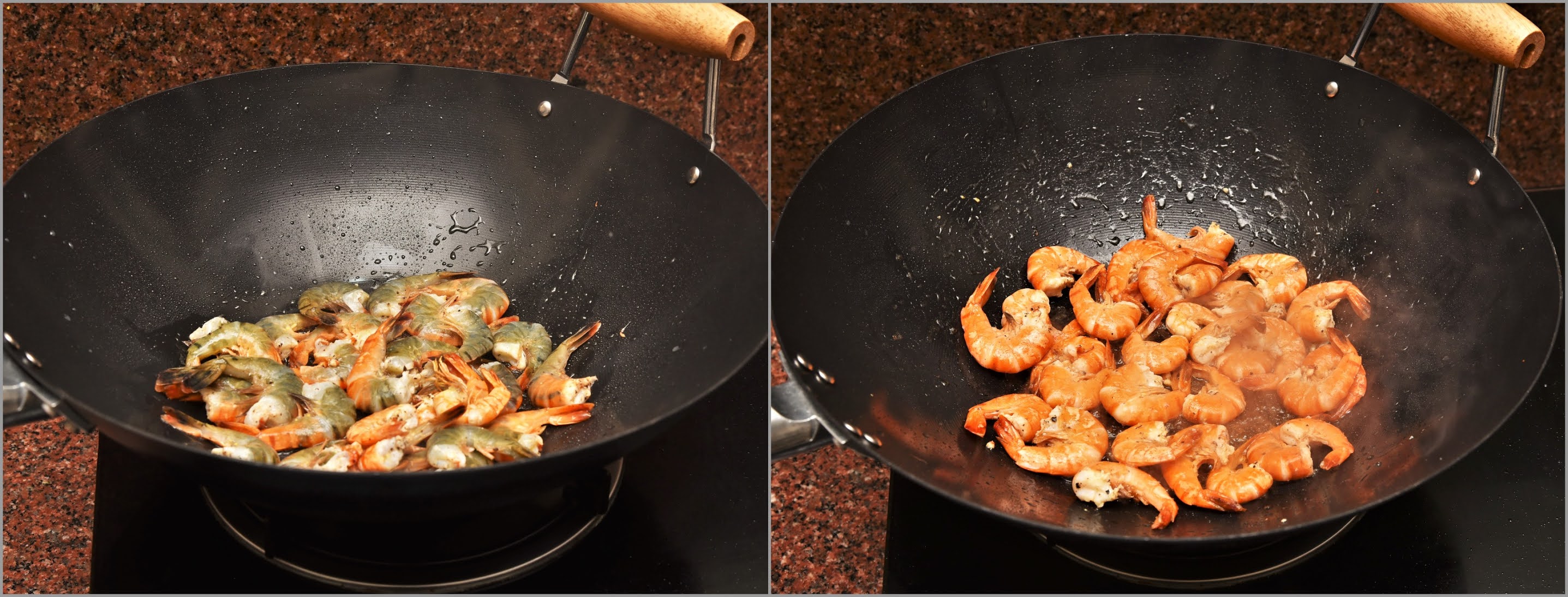 Step 2: Heat a wok/ kadhai and add 2-3 tablespoons of oil. Once the oil is heated, add marinated prawns and saute for a few minutes until they turn red. Keep the gas in medium flame.