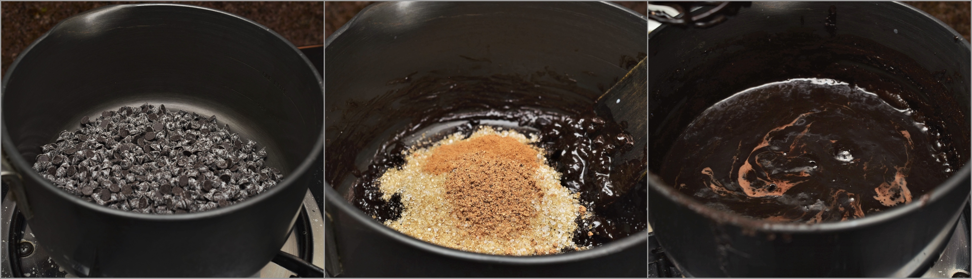 Step 2: Melt the chocolate chips in a saucepan. Keep the gas in low flame. Add sugar, cinnamon, nutmeg powder and whisk it gently. Add milk and continuously keep whisking. Don’t pour the entire milk at a time, add 3-4 tablespoons first, check the consistency and add more milk if required. Within 3-5 minutes, once it starts boiling, turn the gas off.