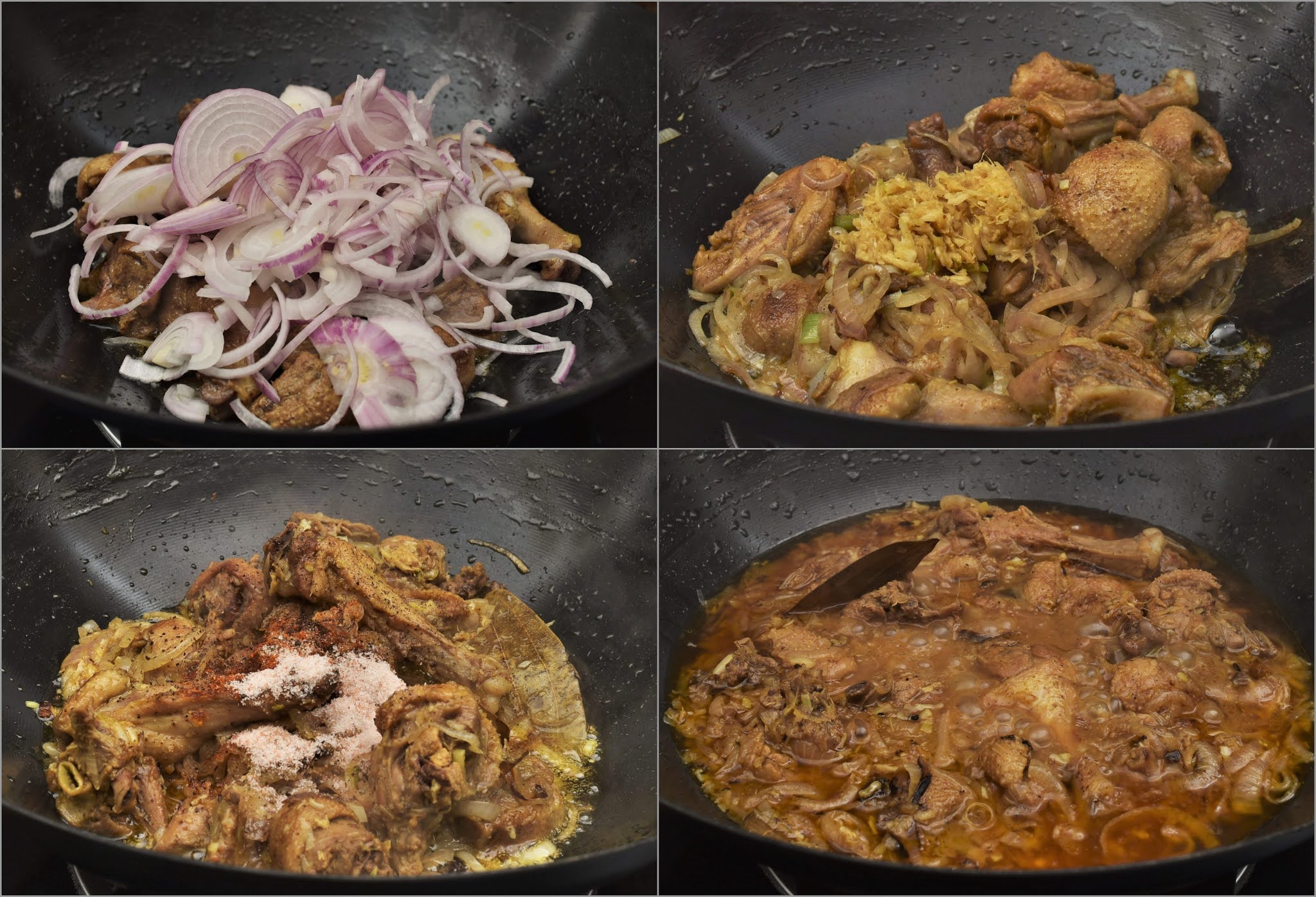 Step 3: At this stage, add the chopped onion. Saute it for another 10-15 minutes until the onion becomes translucent and brown. Then add the ginger-garlic paste and saute for two minutes. Now add black pepper and red chilli powder (1 teaspoon of each) and salt as per taste. Saute it for another 2-3 minutes and add water (about 200-250 ml) for cooking. Lower the flame, cover the lid and let it simmer for about 45 minutes until the meat is tender.