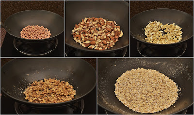 Step 2: Heat a pan and roast the oats and dry fruits (cashews, peanuts, almond and walnuts) one by one and keep them aside.