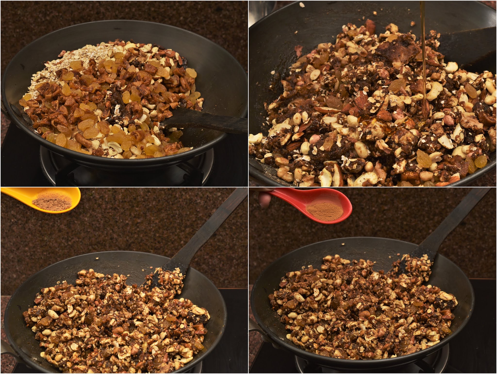 Step 4: Now add the oats and all dry fruits one by one and mix them well. Add honey and sprinkle the cinnamon and nutmeg powder. Stir it constantly until all the ingredients are bonded with each other and you get a thick sticky texture.