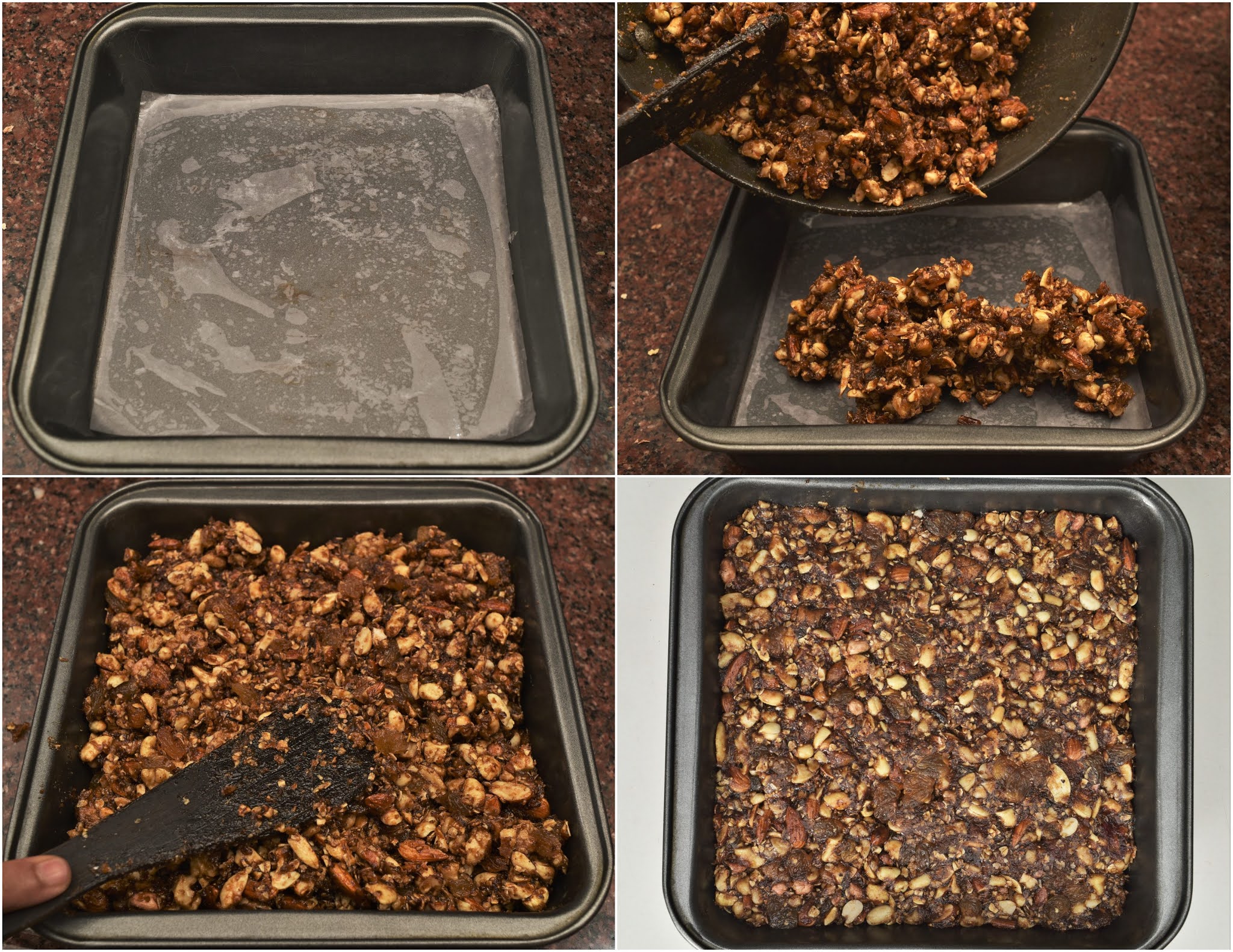 Step 5: Grease a steel tray or a baking tray with oil and put butter paper on it. Grease the butter paper as well. Now transfer the mixture into the tray and spread it evenly. Press it with a flat bottomed small bowl or if you can bear the temperature press it with your palm to set it. Once it comes to room temperature refrigerate it for an hour and let it be firm.