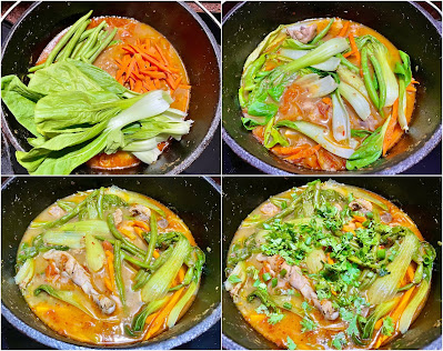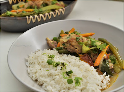 Step 4: Once the chicken is cooked add the vegetables, mix it and cover for another 5-8 minutes. It’s better to use vegetables that take lesser time to cook, such as collard greens, bok choy, beans, carrot, turnip etc. Do not overcook the vegetables, let them be crunchy and juicy. After 5-8 minutes toss some chopped coriander leaves and spring onions over the curry and turn the gas off.