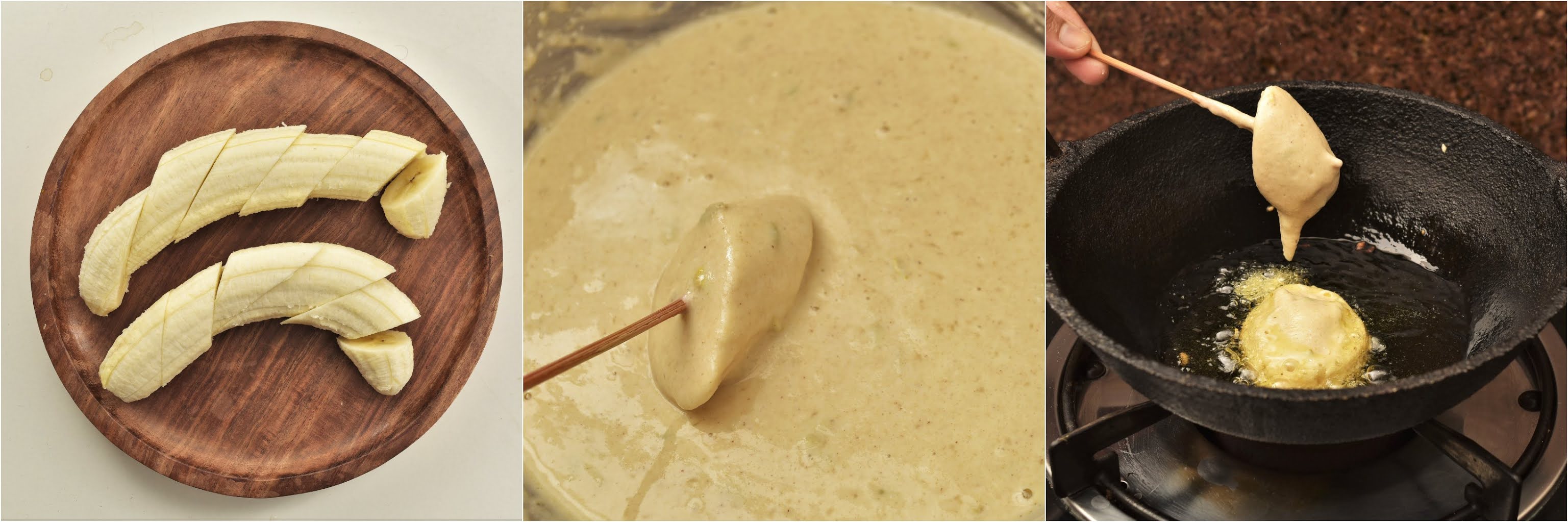 Step 1: Except bananas and oil, mix all the above ingredients in a mixing bowl and add water to make a thick batter. Cut the bananas in one-inch size. Meanwhile, heat oil in a deep pan or kadhai for frying.