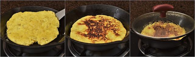 Step 3: Check the bottom of the omelette carefully flipping a part of it with a spatula. Once you get a crispy golden layer gently turn it upside down and cover again. Let it cook for another 2 minutes on low flame until the other side turns crispy and golden brown in colour. Once done take it out on a plate and set it aside.
