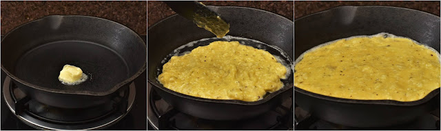 Step 2: You can make the omelette in two batches as per convenience. Heat a pan and add one teaspoon of butter. Once hot add half a portion of the omelette mix and spread it across the pan gently. Cover the lid and let it cook on low flame for 2 minutes.