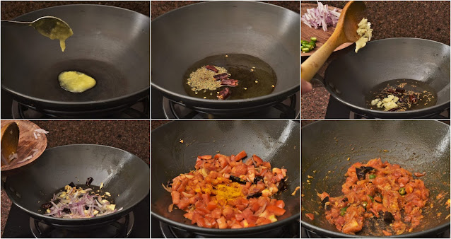 Step 2: For tempering, heat a pan or kadhai and add 1-2 tablespoons of ghee. As soon as the ghee is hot add cumin seeds and dry red chillies followed by the ground garlic and chopped onion. Stir it for a minute and add the chopped tomatoes. Sprinkle a pinch of salt and turmeric powder if needed. Add green chillies and fry the spices for 1-2 minutes on medium to low flame.