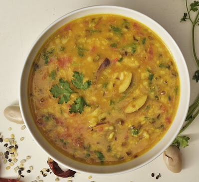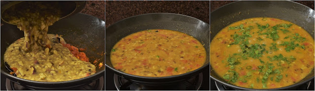 Step 3: Once the tomatoes become tender and the spice is separated from the oil add the boiled lentils. Bring it to a boil. Check the thickness, if required add some hot water. Simmer it for a minute and add chopped coriander leaves. Turn the gas off, you can add some more ghee over it for fragrance.