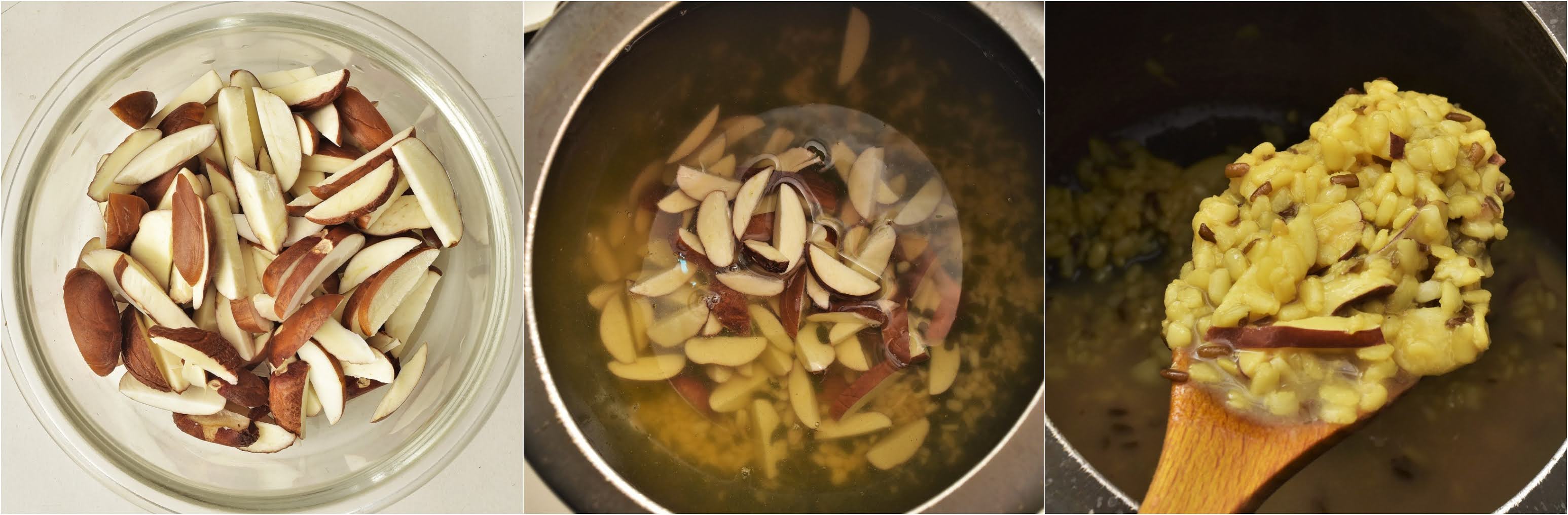 Step 1: Peel the outer skin of the Jackfruit seeds and roughly chop them. Wash the lentils and put them in a pressure cooker, add the jackfruit seeds and add approx 3 cups of water. Add salt as per taste and about half a teaspoon of turmeric powder. Lock the cooker and let it cook in medium flame for 8-10 minutes. After 4-5 whistles turn the gas off and let the steam go out.