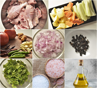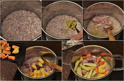 Step 2: Add two cups of water to a pot and bring it to a boil. Add the chopped onion followed by ginger, garlic and chilli paste. Add the chicken, vegetables and an adequate amount of water (approx 500 ml) for cooking. Keep the gas on medium flame.