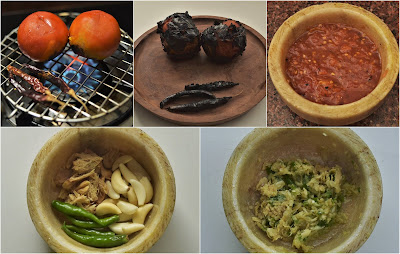 Step 1: Grill the tomatoes on the gas or a wood oven until they are cooked from inside and the skin turns black. Do the same with the dry red chillies. This process will add a smoky flavour to the dish. Once done, remove the tomato skin and mash them. Coarsely grind the dry red chillies as well and keep them aside. Add the green chillies, ginger and garlic into a mortar and make a paste.